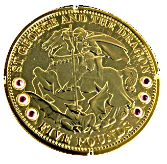 Image of Saint George slaying a dragon, inset with six rubies forming his cross.