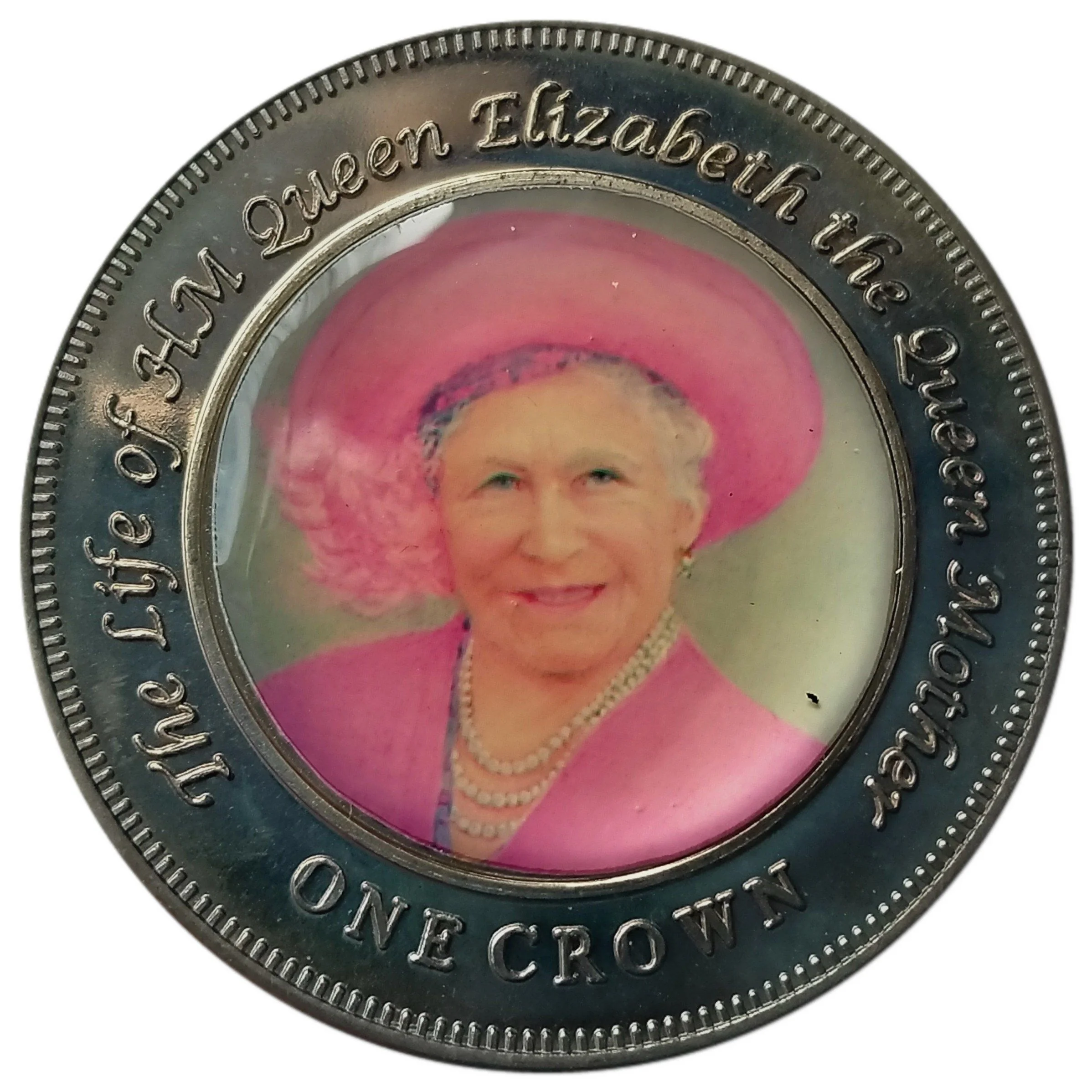 Queen Mother Elizabeth in pink, portrait with legend and denomination.
