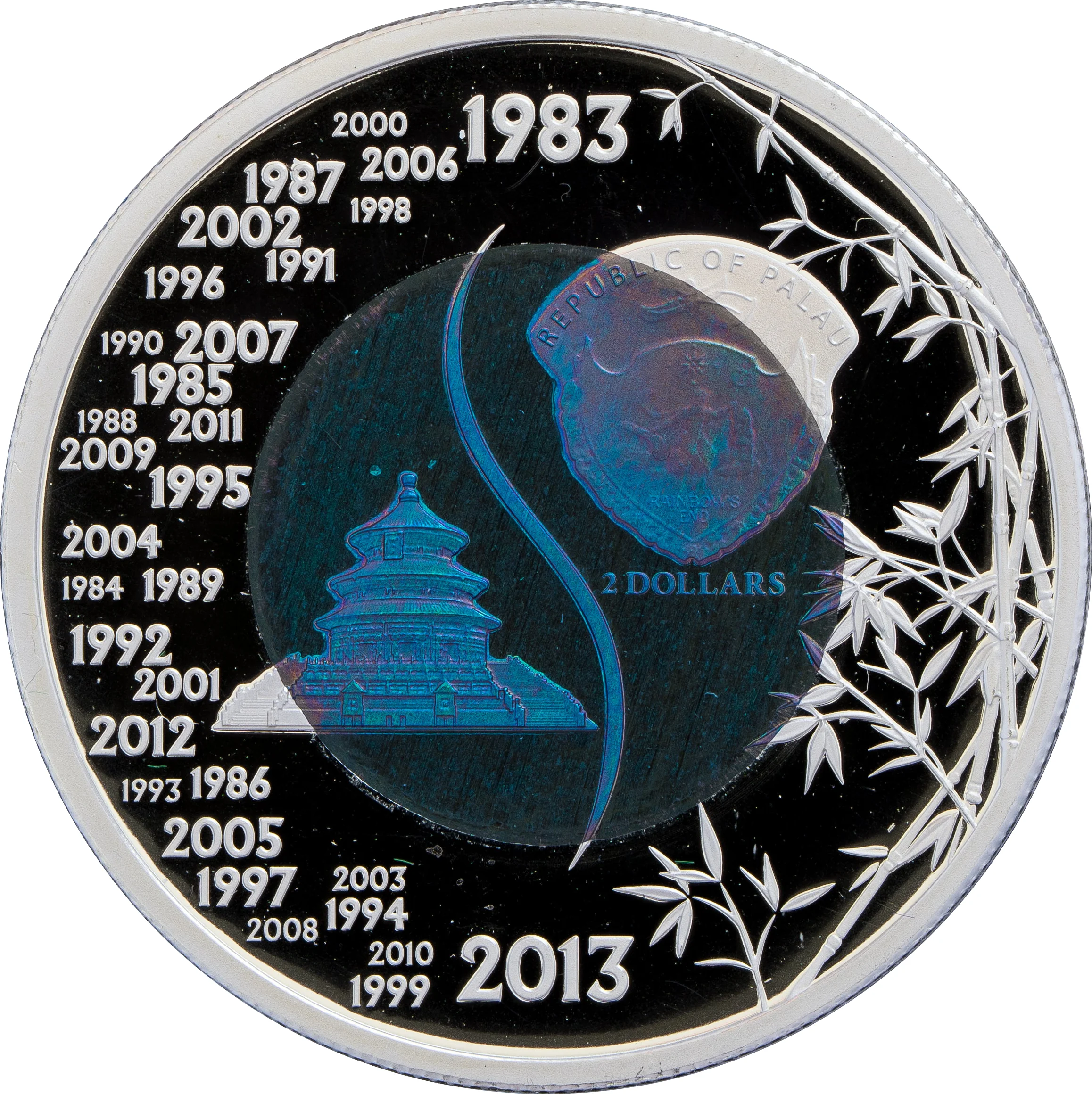 Description: Yin yang-style niobium insert featuring Beijing's Temple of Heaven and Palau's Coat of Arms. Inscriptions show the face value and "Palau." Bamboo and all issue years are in the background.