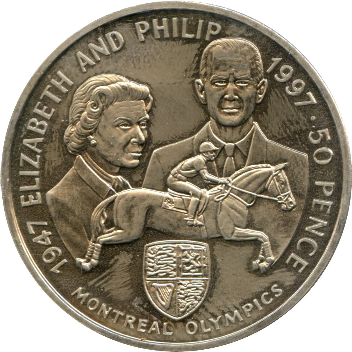 Queen Elizabeth II and Prince Philip with a horse, jumper, and crest.
