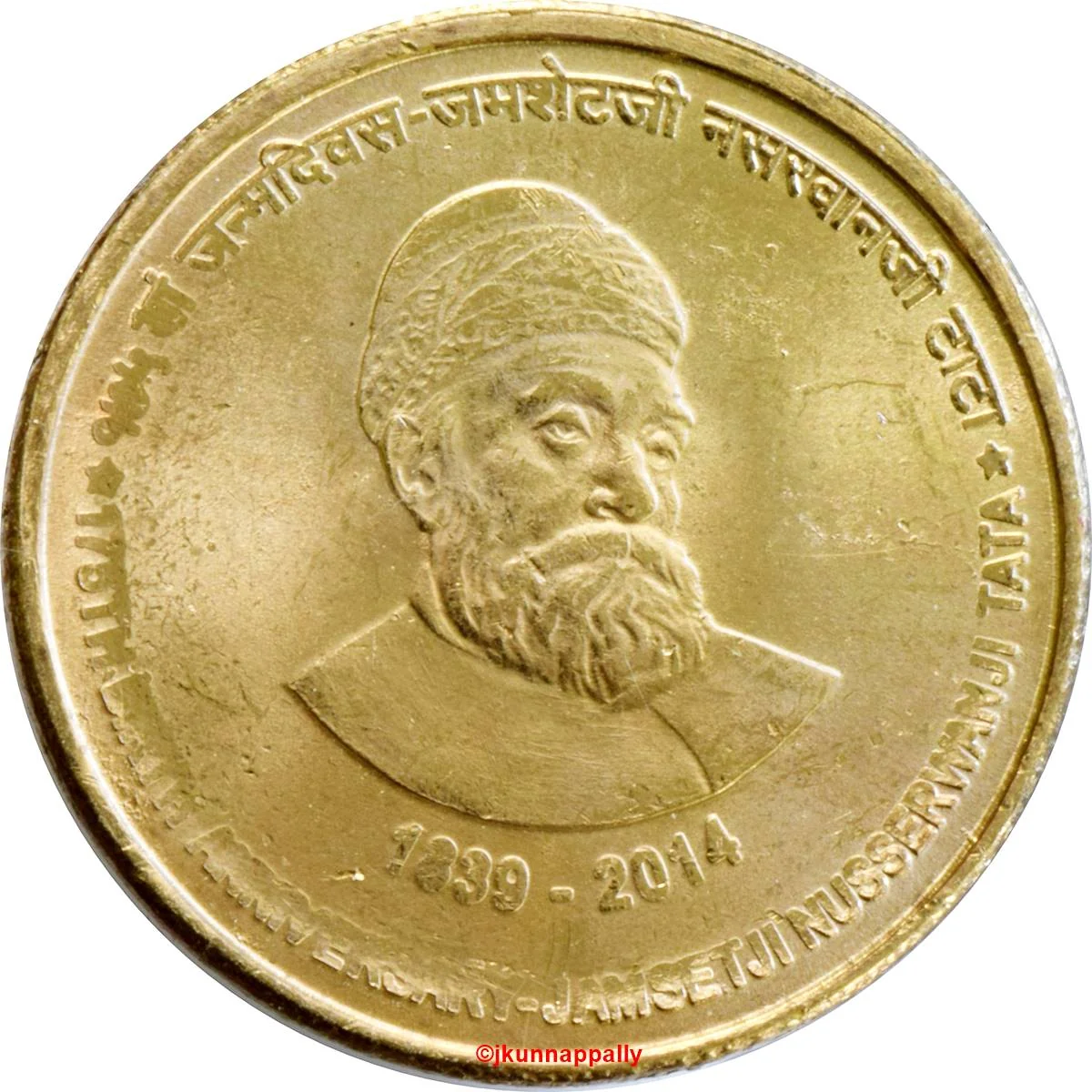 Bust of JN Tata with dates 1839–2014, encircled by English and Devnagari text.