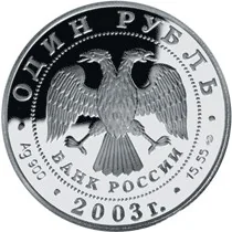 Center: Bank of Russia emblem (two-headed eagle, wings down, with "БАНК РОССИИ" below), within a dotted circle. Rim inscriptions: top - "ОДИН РУБЛЬ", bottom - "2003". Left: metal/fineness. Right: metal content/mint mark.