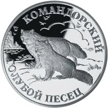 Two blue foxes of the Komandorsky Islands. Rim inscription: "КОМАНДОРСКИЙ ГОЛУБОЙ ПЕСЕЦ" (THE BLUE FOX OF KOMANDORSKY ISLANDS).