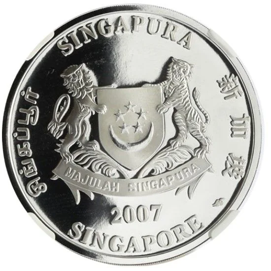 Emblem with date; 'Singapore' encircles it in English, Tamil, Chinese, and Malay.