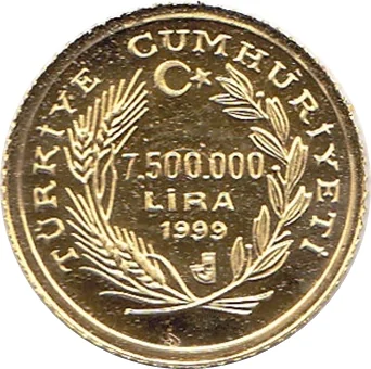 7.500.000 LIRA / 1999 within laurels, Turkish symbol above.