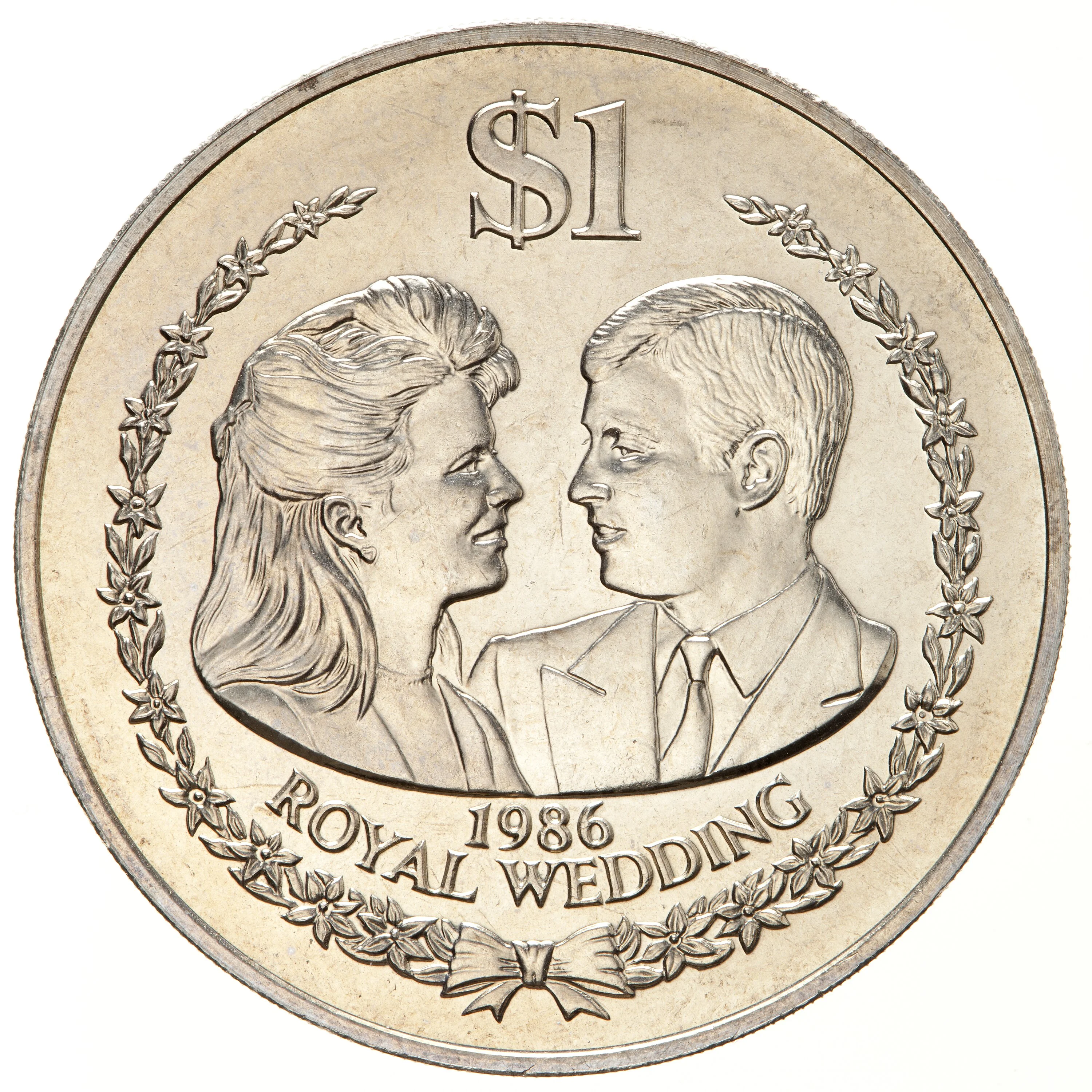 Denomination with portraits of Prince Andrew and Sarah Ferguson in wreath.