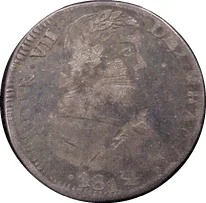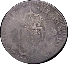 Shield between pillars, banner above. Surrounded by legend, value, mint, and assayer's marks.