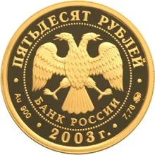 A two-headed eagle with lowered wings and the inscription "БАНК РОССИИ" forms the central emblem. It is surrounded by a dotted circle and the rim inscriptions: "ПЯТЬДЕСЯТ РУБЛЕЙ" above, the year "2003" below, with metal details and the mint mark on the sides.