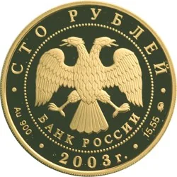Center: Bank of Russia emblem (two-headed eagle, wings down, with "БАНК РОССИИ" below), within a dotted circle. Rim inscriptions: top - "СТО РУБЛЕЙ", bottom - year "2003". Left: metal/fineness mark. Right: fine metal content and mint mark.