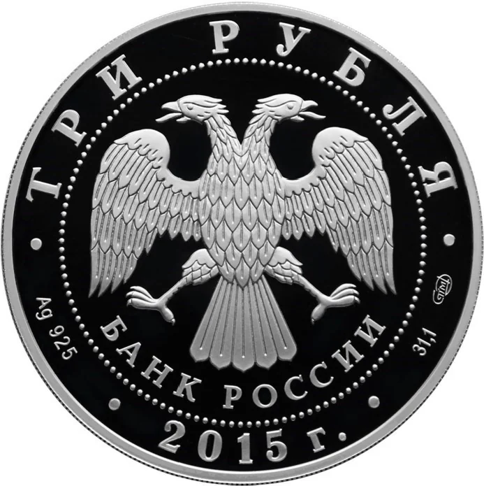 Center: Bank of Russia emblem (two-headed eagle, "БАНК РОССИИ"), circled by dots. Rim inscriptions: top – "ТРИ РУБЛЯ"; bottom left – metal and fineness; center – "2015 г."; bottom right – metal content and mint mark.