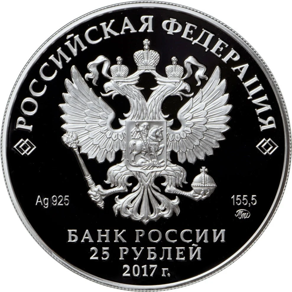 The obverse features the State Coat of Arms of the Russian Federation, inscriptions for "RUSSIAN FEDERATION," "BANK OF RUSSIA," "25 ROUBLES," "2017," metal specification, purity, mint mark, and precious metal content.
