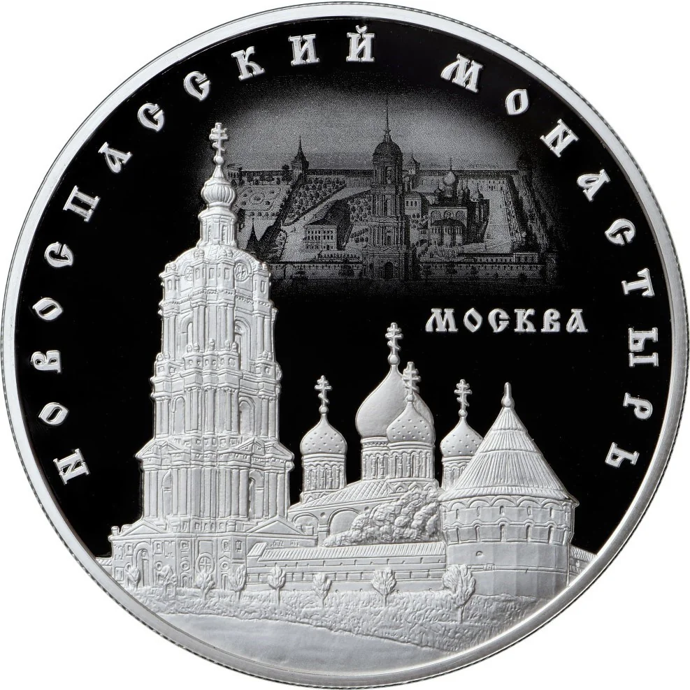 The reverse features the Novospassky Monastery ensemble below and its engraved panorama above, with the inscriptions "НОВОСПАССКИЙ МОНАСТЫРЬ" above and "МОСКВА" between the images.
