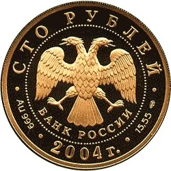 Center: Bank of Russia emblem (two-headed eagle, wings down, with "BANK OF RUSSIA" below), circled by dots. Rim inscriptions: top – "ONE HUNDRED ROUBLES", bottom – year "2004". Left: metal and fineness. Right: fine metal content and mint mark.