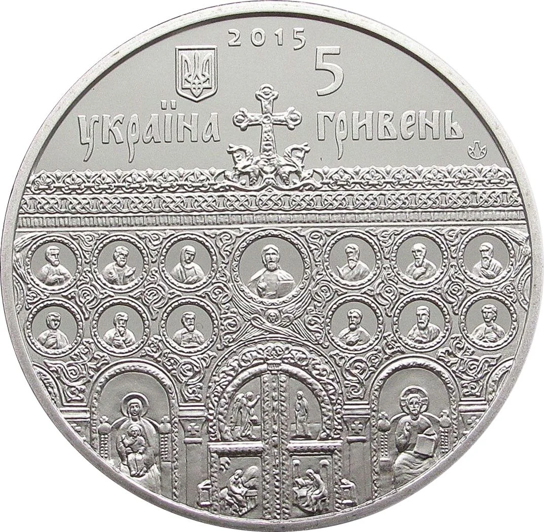 Obverse: 2015 above. Left: Small Coat of Arms with "УКРАЇНА" below. Right: face value "5/ГРИВЕНЬ" with Mint mark. Central design: a conventionalized fragment of an icon-stand and Holy Doors.
