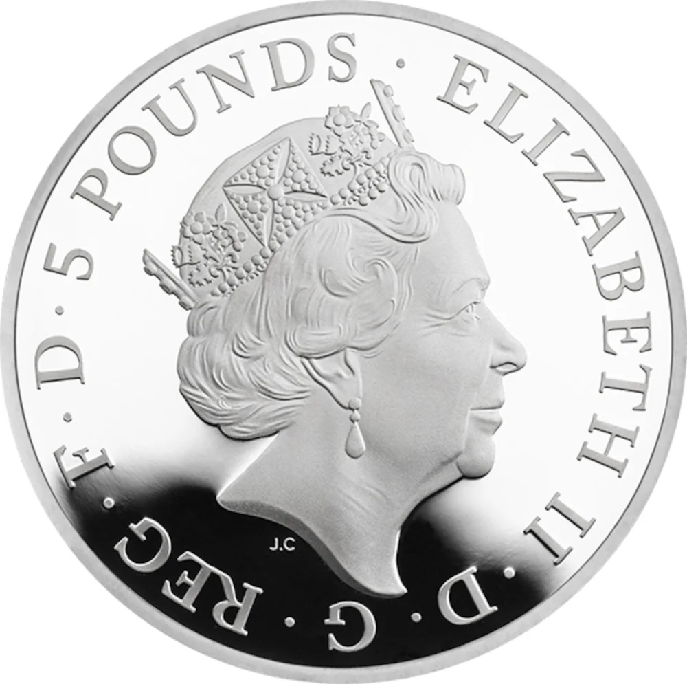 Elizabeth II, by the Grace of God, Queen, Defender of the Faith, 5 Pounds.