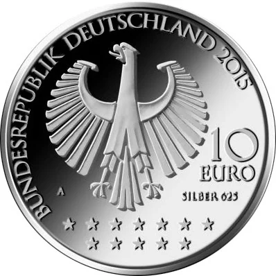 A stylized federal eagle with "10 EURO" to its left, above the EU's twelve stars. "BUNDESREPUBLIK DEUTSCHLAND 2015" arches above, with the Berlin mint mark "A" by the eagle's right leg. "SILBER 625" below the face value denotes its silver content.