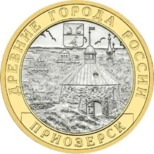 The Priozersk coat of arms above the town's panorama, featuring the round Gate Tower of its old fortress. Circular inscriptions: "ДРЕВНИЕ ГОРОДА РОССИИ" (top) and "ПРИОЗЕРСК" (bottom).