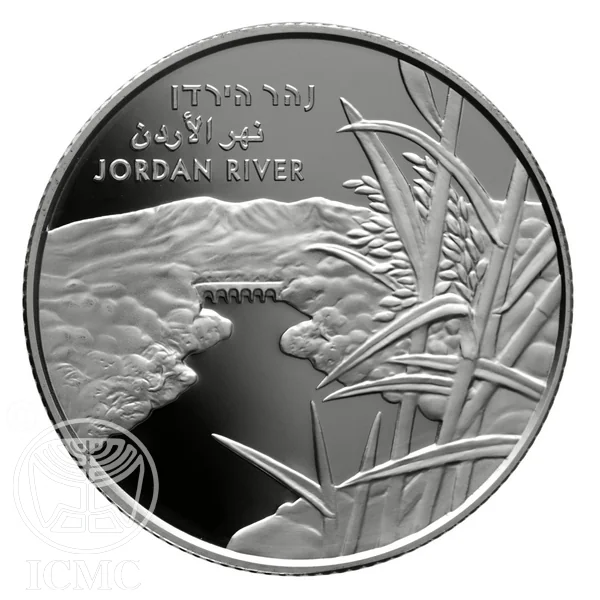 Face value, state emblem, "Israel" in three languages, mint year and mark, and the Jordan River flowing from the Sea of Galilee to the Dead Sea.