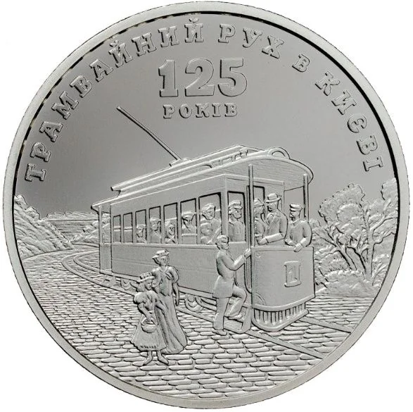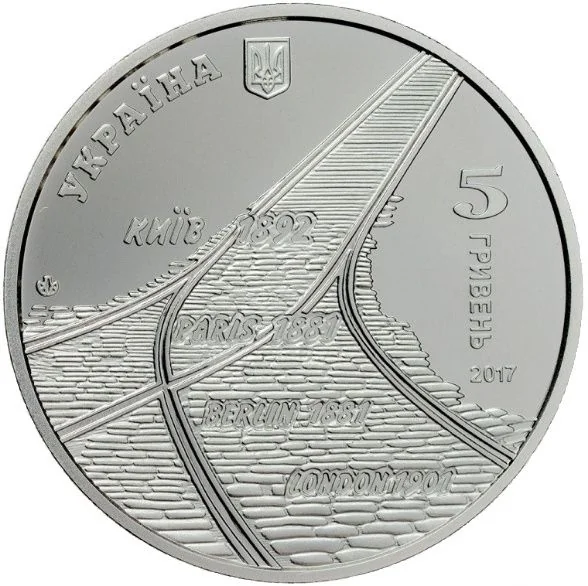 Description: Ukraine's small coat of arms is flanked left by УКРАЇНА and right by the vertical face value 5 ГРИВЕНЬ and year 2017. The design features tram tracks on stone pavement arching skyward, symbolizing progress, with the legends КИЇВ 1892/PARIS 1881/BERLIN 1881/LONDON 1901 marking early electric tram launches. The NBU mint mark is present.