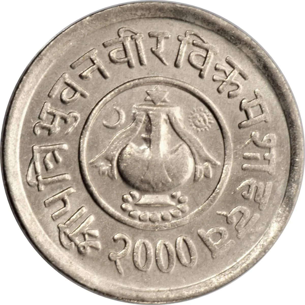 Urn in center. Devnagari legend: "Shree 5 Tribhuvan Veer Vikram Shahdev." Date beneath.
