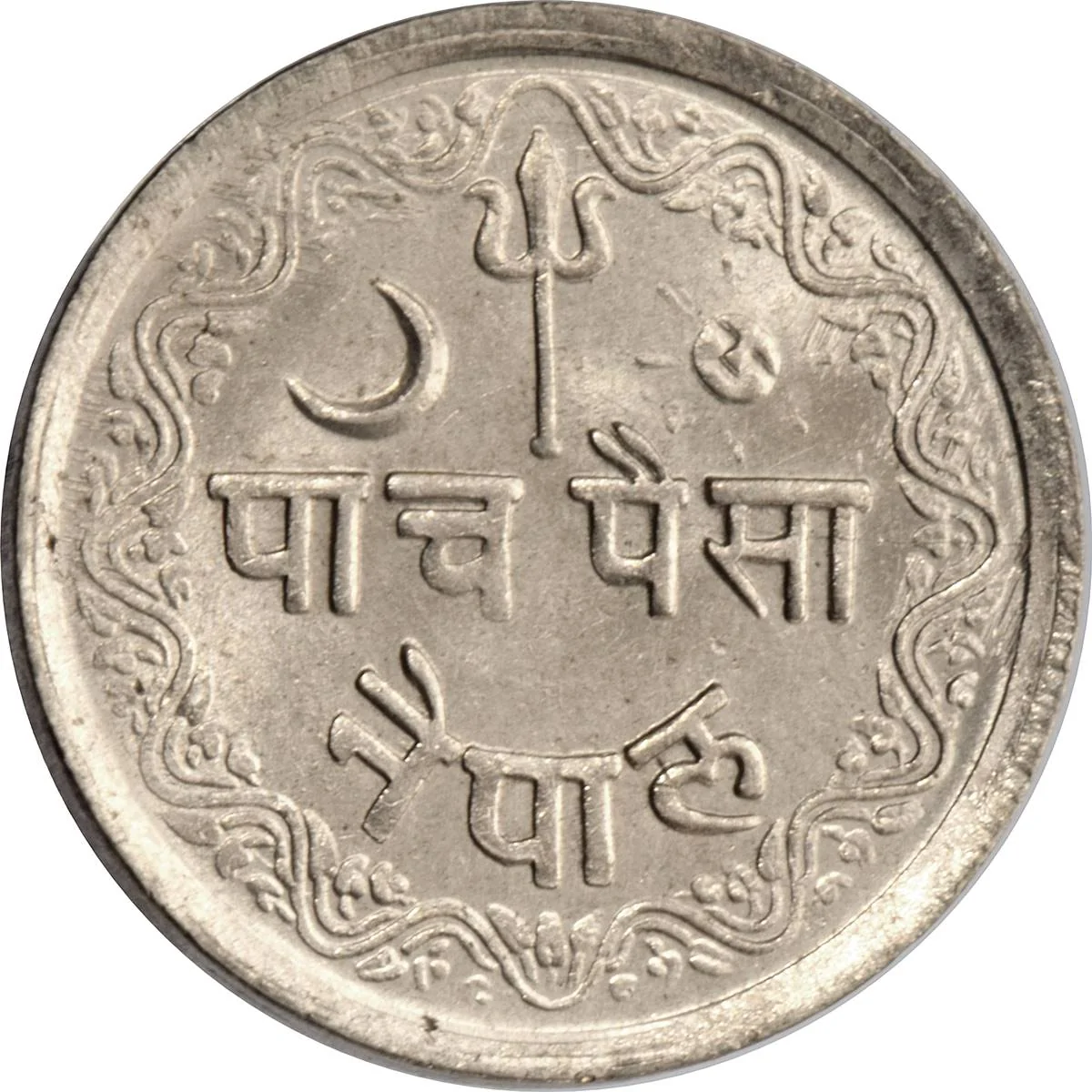 Crescent, star, and trident above "Panch Paisa, Nepal" in Devanagari.