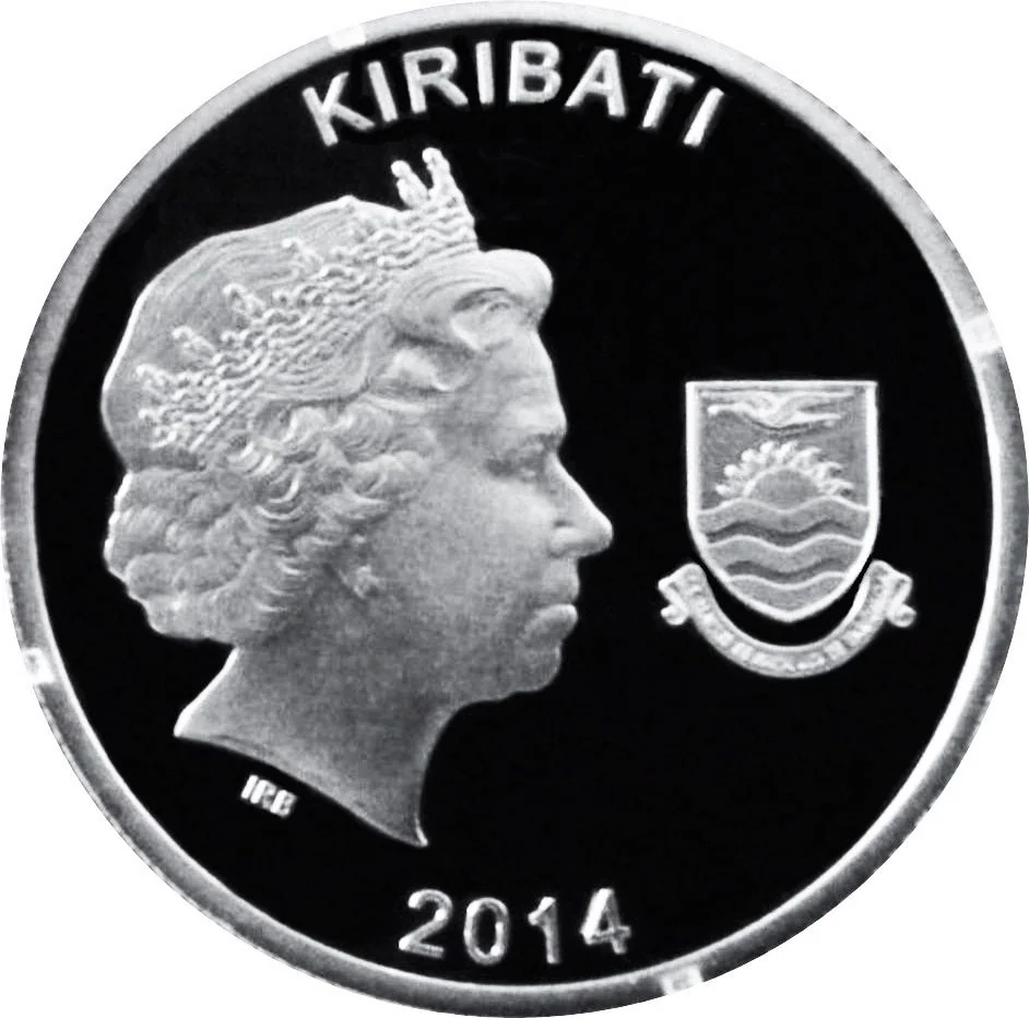 Queen Elizabeth II left, Kiribati coat of arms right.