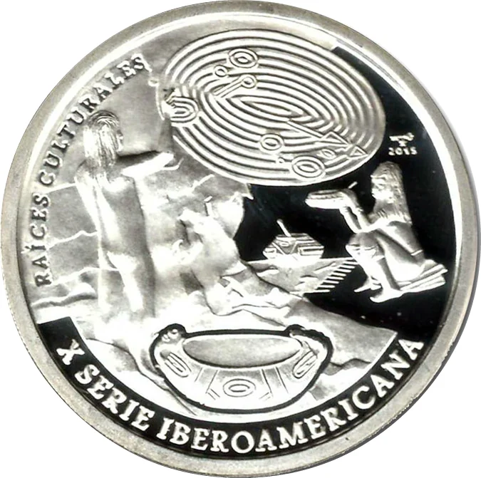 Description: Cuba's coat of arms, encircled by the arms of the nine minting nations (Argentina, Cuba, Ecuador, Spain, Guatemala, Nicaragua, Paraguay, Peru, Portugal). Legend top, fineness left, value bottom, weight right.