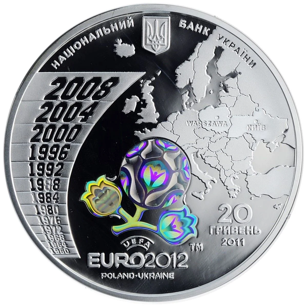 The coin features Ukraine's Small Coat of Arms with "НАЦІОНАЛЬНИЙ БАНК УКРАЇНИ" above. The central design is a map of Europe marked with "КИЇВ" and "WARSZAWA," overlaid with a holographic UEFA Euro 2012 logo and the text "UEFA/EURO 2012TM/POLAND-UKRAINE." To the left are the years of previous championships from 1960; to the right are the denomination and year: "20 ГРИВЕНЬ 2011."