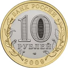 The central disc features the denomination "10 РУБЛЕЙ". Inside the "0", the number "10" and "РУБ" appear alternately when tilted. The mint mark is below. The ring reads "БАНК РОССИИ" above and "2009" below, with stylized plant branches extending onto the disc from the sides.