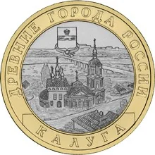 Central: town image. Upper left: Kaluga's coat of arms. Rim inscription: top - "ДРЕВНИЕ ГОРОДА РОССИИ", bottom - "КАЛУГА".