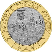 Central disc: Galich town panorama. Upper left: Galich coat of arms. Ring inscription: top - "ДРЕВНИЕ ГОРОДА РОССИИ", bottom - "ГАЛИЧ".
