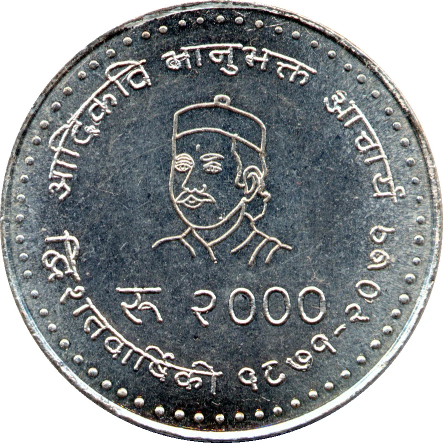 Portrait of Nepali poet Bhanu Bhakta Acharya with denomination.