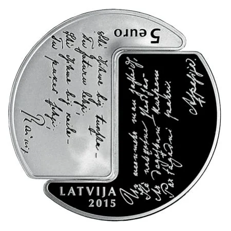 The left side bears a Rainis poem and signature; the right, an Aspazija poem and signature. "5 euro" is at top right, and "LATVIJA" with 2015 is at bottom left.