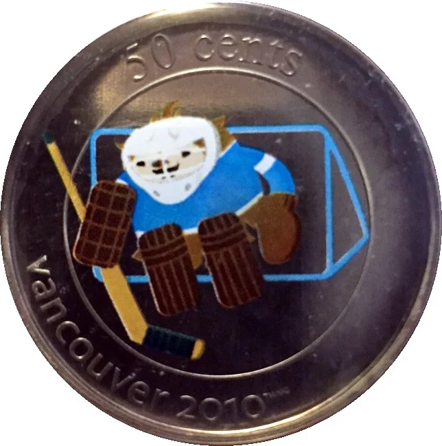 Coloured illustration of Olympic mascot Quatchi playing ice hockey.