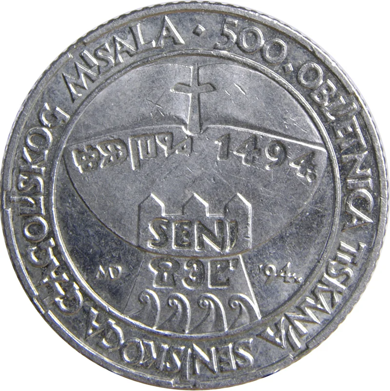 An "S" in Glagolitic script forms the design. Its top becomes a book with a cross (the Missal), above the years 1494 in Arabic and Glagolitic numerals. Its lower part becomes the silhouette of Nehaj Town, flanked by the mint year '94 and the author's initials MD.