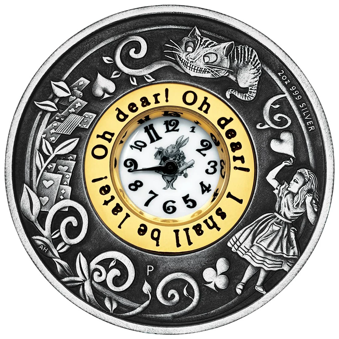 A clock with the White Rabbit on its face, surrounded by Alice, the Cheshire Cat, and playing cards.