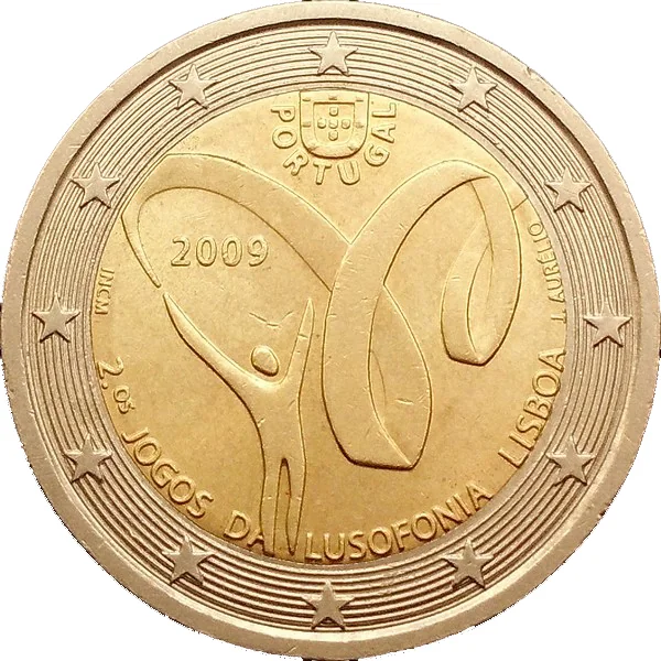 A gymnast with a ribbon swirls below the year ‘2009’ and above the Portuguese shield and country name. The outer ring features the 12 EU stars on concentric lines. The bottom edge has the inscription ‘2.os JOGOS DA LUSOFONIA LISBOA’ between ‘INCM’ and ‘J. AURÉLIO’.