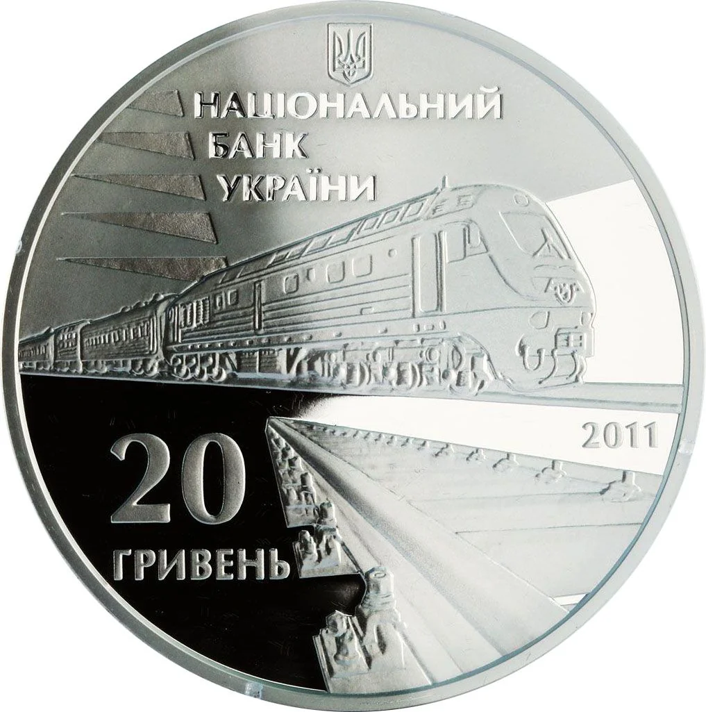 The obverse features Ukraine's Small Coat of Arms with "NATIONAL BANK OF UKRAINE," a modern high-speed train on tracks, the face value "20 HRYVEN," and the year "2011."