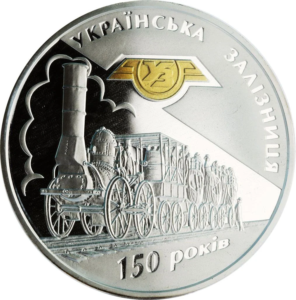 A vintage Ukrainian Railways train is shown with "УКРАЇНСЬКА ЗАЛІЗНИЦЯ" above and "150 РОКІВ" below the company logo.