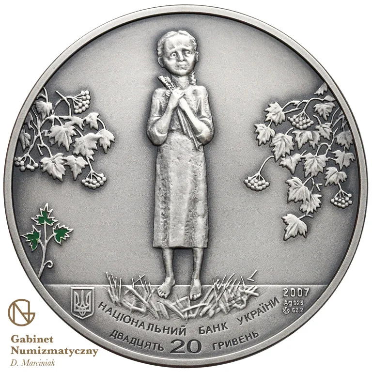 Description: A girl holding corn gleanings stands in a stubble field, flanked by viburnum branches. The left side features the Small National Emblem of Ukraine, the right shows the year 2007. Semi-circular inscriptions include: "ДВАДЦЯТЬ 20 ГРИВЕНЬ", the metal Ag 925, weight 62.2, "НАЦІОНАЛЬНИЙ БАНК УКРАЇНИ", and the Mint's logotype.