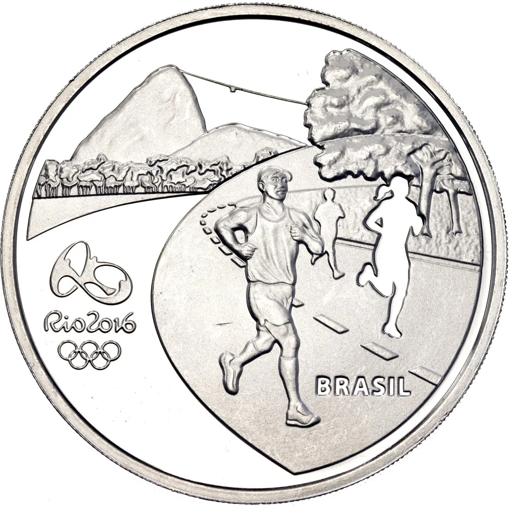 Running at Aterro do Flamengo with Sugar Loaf in the background, featuring the Rio 2016 logo and "Brasil."