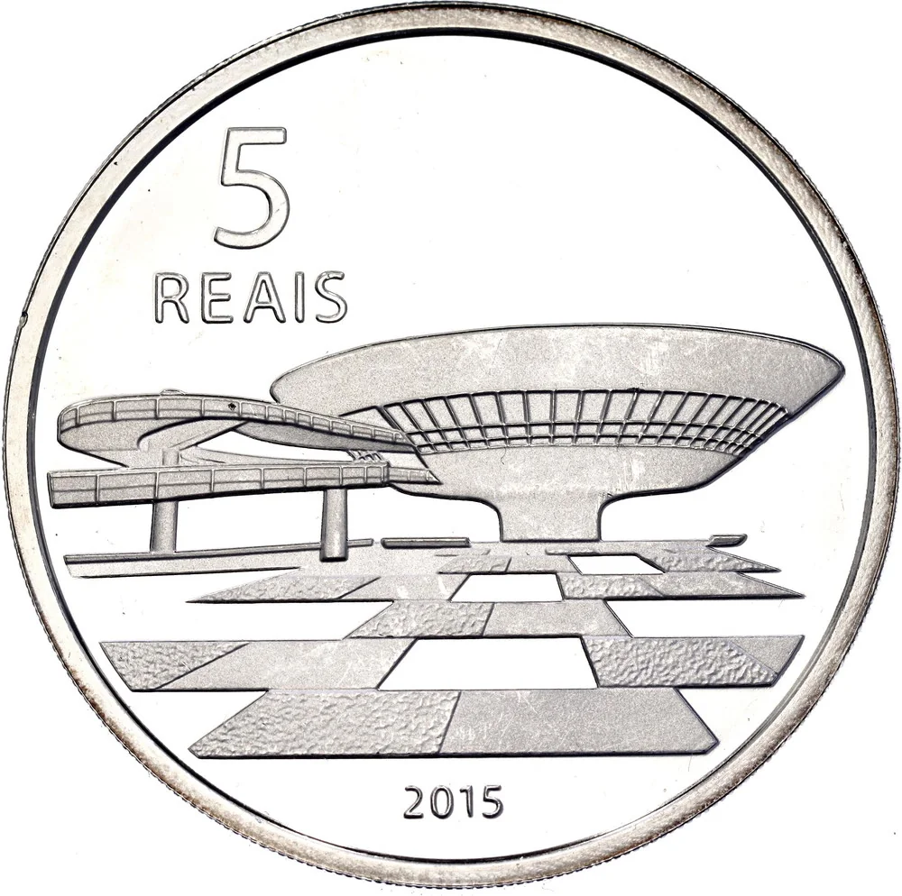 The reverse features the Niterói Contemporary Art Museum by Oscar Niemeyer, with its 2015 five-reais face value.