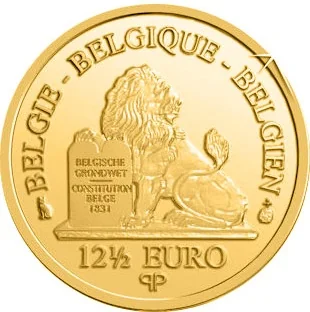 A Belgian lion rests its paw on a stele inscribed BELGISCHE GRONDWET - CONSTITUTION BELGE. Above are BELGIE - BELGIQUE - BELGIEN; below, 12½ EURO - QP.