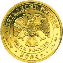 The obverse features the Bank of Russia emblem (a two-headed eagle with wings down, above the inscription "БАНК РОССИИ") within a dotted circle. The rim inscriptions read "ПЯТЬДЕСЯТ РУБЛЕЙ" at the top, and the year "2004" at the bottom. To the left are the metal and fineness marks; to the right, the pure metal content and mint mark.
