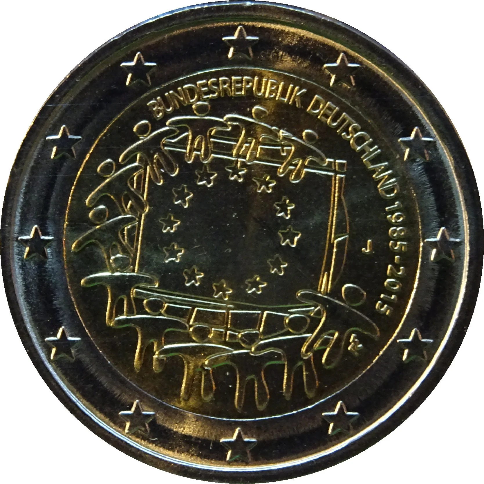 The design transforms the EU flag's twelve stars into embracing figures, symbolizing unity and a shared future. It includes "1985-2015" and the artist's initials (Georgios Stamatopoulos), surrounded by the circle of EU stars.
