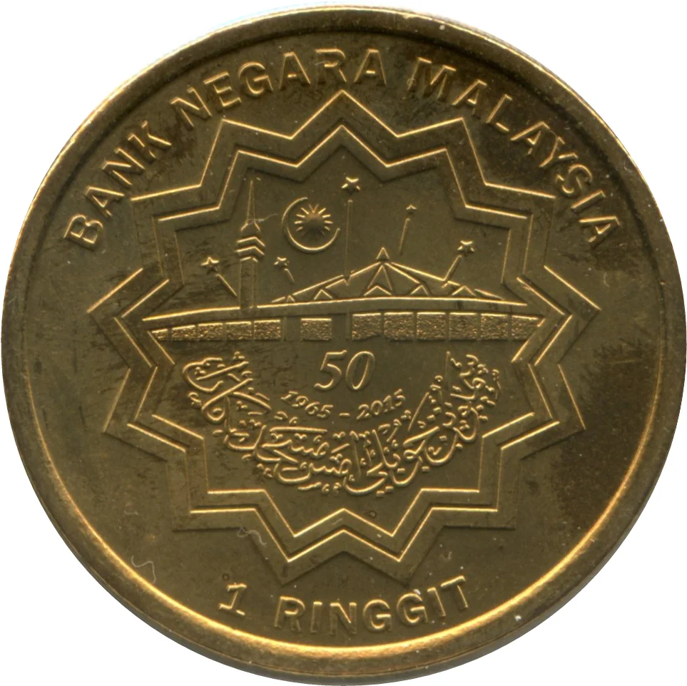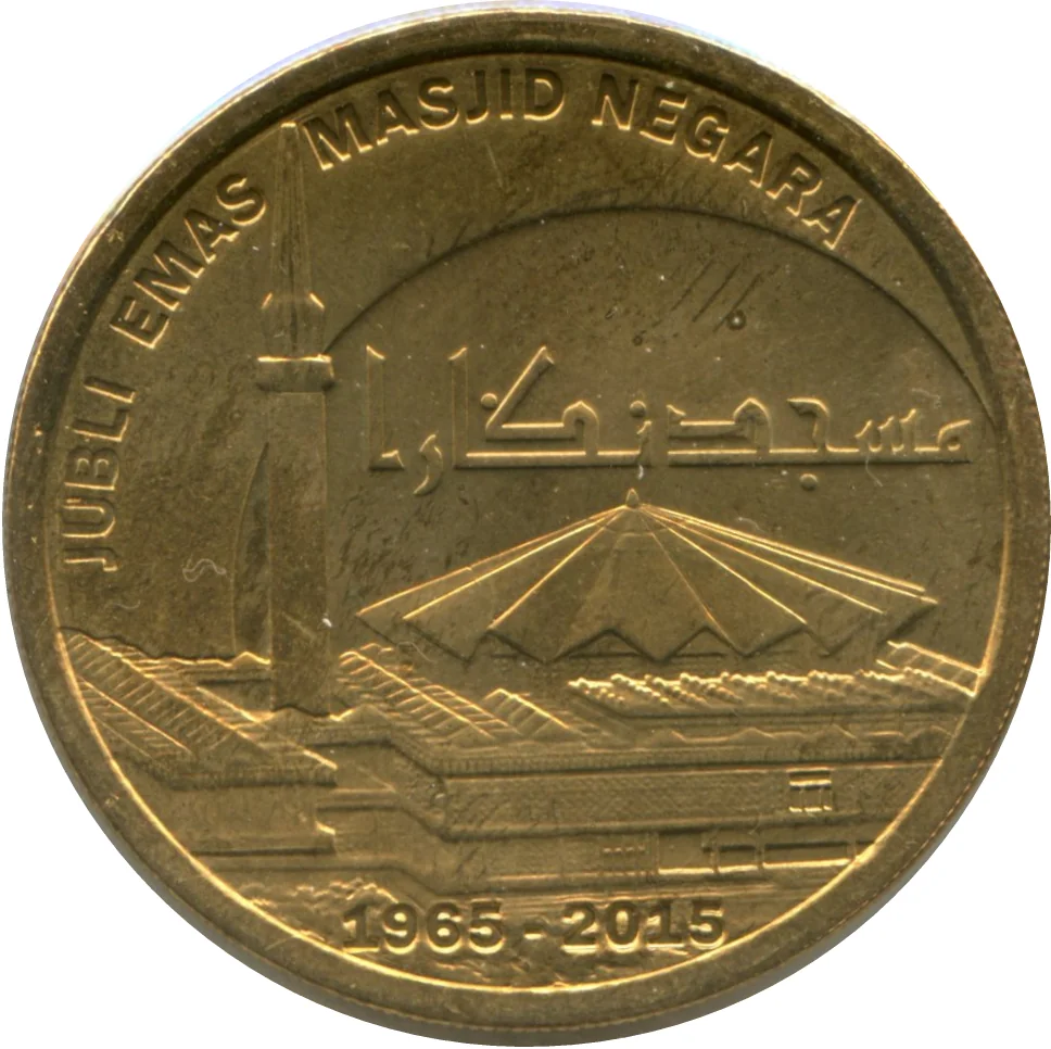 Description: A 13-pointed star frames the National Mosque, a crescent and star, "50" for the anniversary, Arabic script, and the denomination.