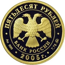 The central Bank of Russia emblem [two-headed eagle with wings down, over "БАНК РОССИИ"] is inside a dotted circle. The rim inscriptions read: "ПЯТЬДЕСЯТ РУБЛЕЙ" above, the year "2005" below, with the metal specification on the left and its fine content and mint mark on the right.