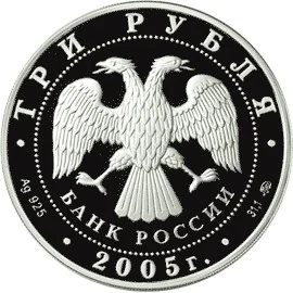 Center: Bank of Russia emblem [two-headed eagle, wings down, with "БАНК РОССИИ" below], circled by dots. Rim inscriptions: top – "ТРИ РУБЛЯ", bottom – year "2005". Left: metal/fineness. Right: metal content/mint mark.