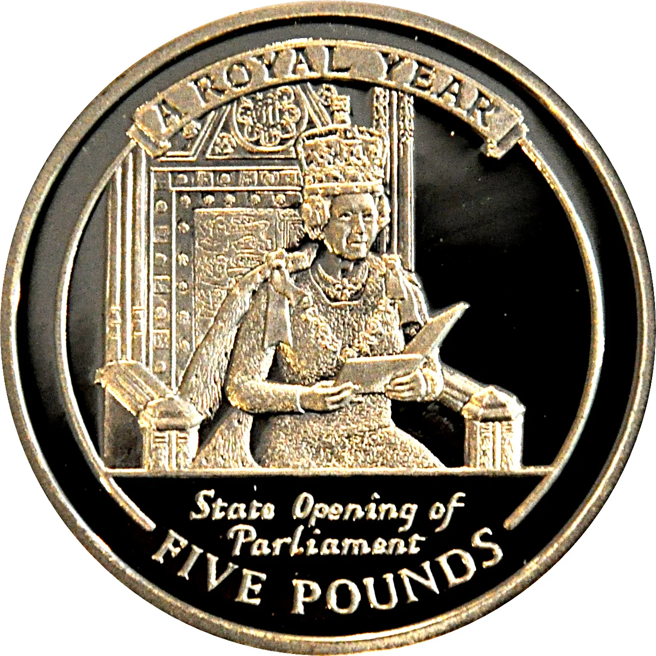 Queen Elizabeth II facing right, wearing the George IV State Diadem, surrounded by legend and date.
