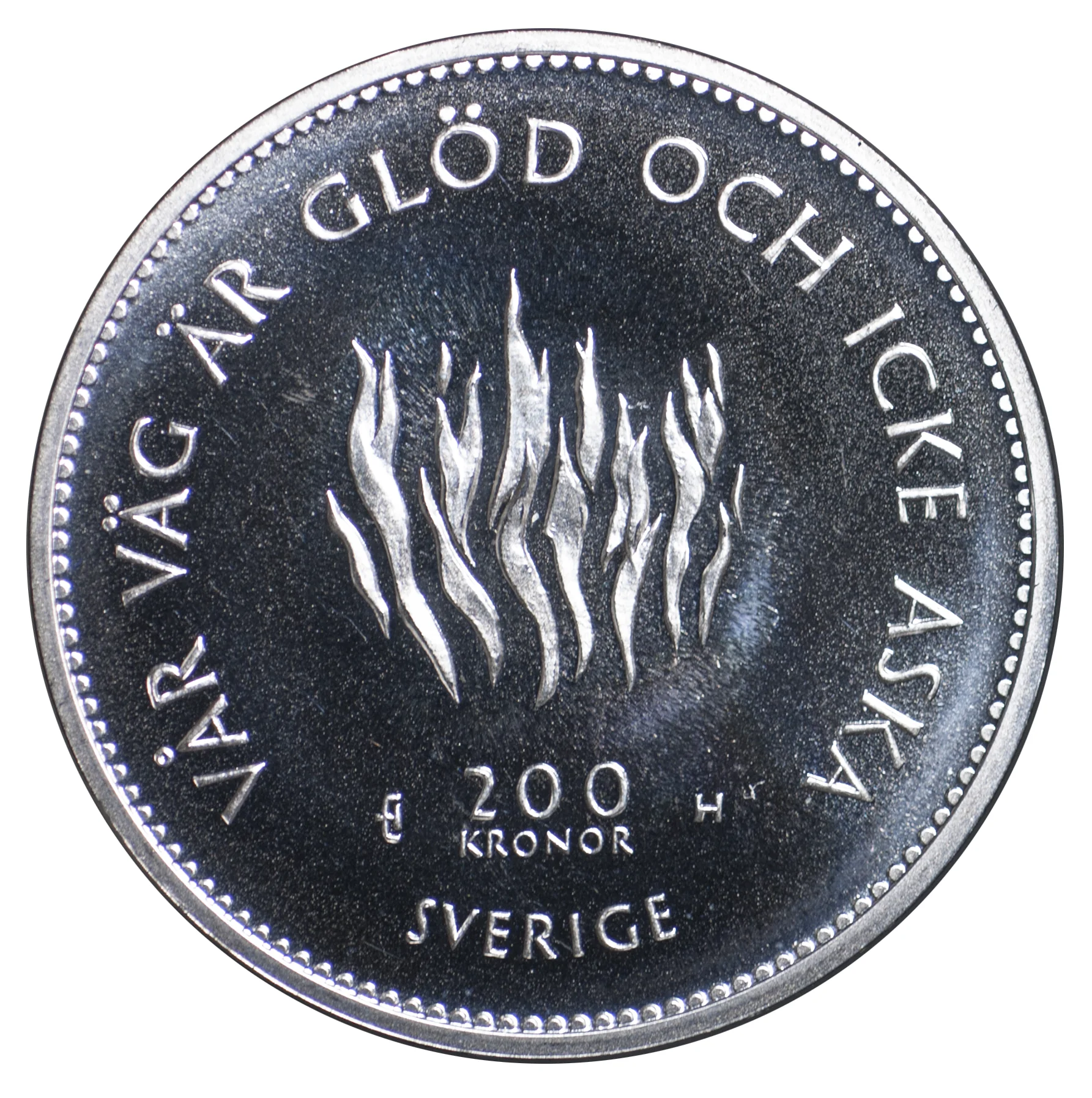 Stylized flames above the value. Below, text from Dag Hammarskjöld's interpretation of Saint-John Perse's "Chronique." To the left of the flames, an "E" for the Eskilstuna mint; to the right, an "H" for the Riksbank Governor.